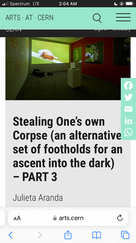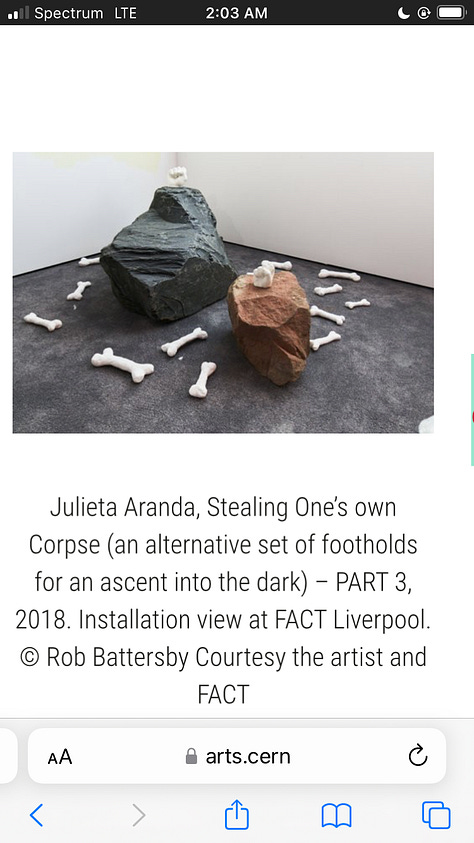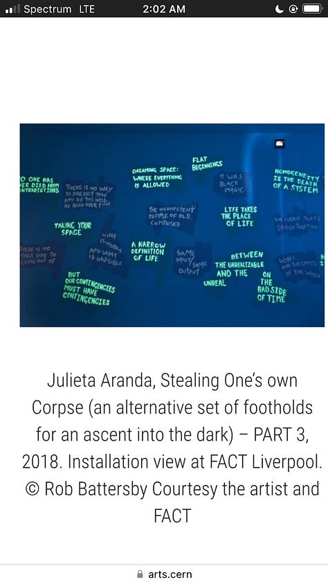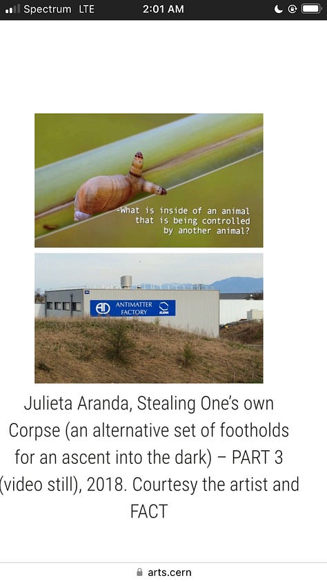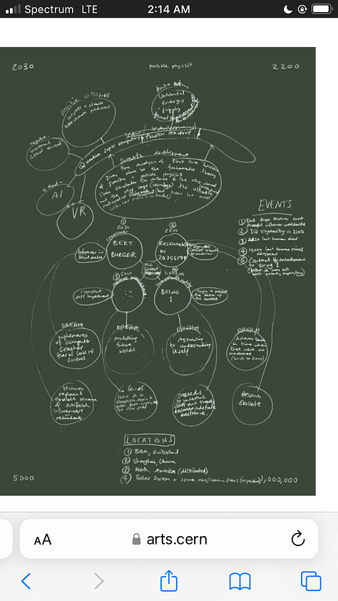 From CERN Artist “Stealing One’s own Corpse”: antimatter factory, one animal control of another animal, 2030 most powerful social influencer Burt Burger until computer crashes, 2100 IQ singularity, 2220 (?) (scribbles purposely hard to read?) last human dies, 10,000 last human ruin disappears, quantum super computing, fusion new technology (Dr. Wood?), AI, VR, social unrest (duh), unlimited energy (Judy Wood… anyone?)…